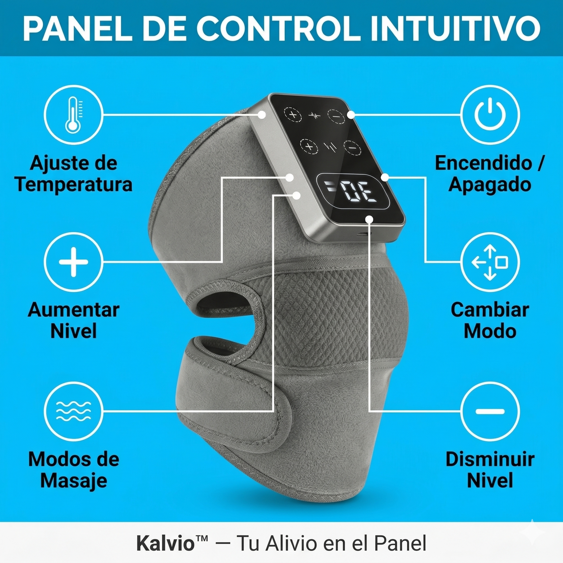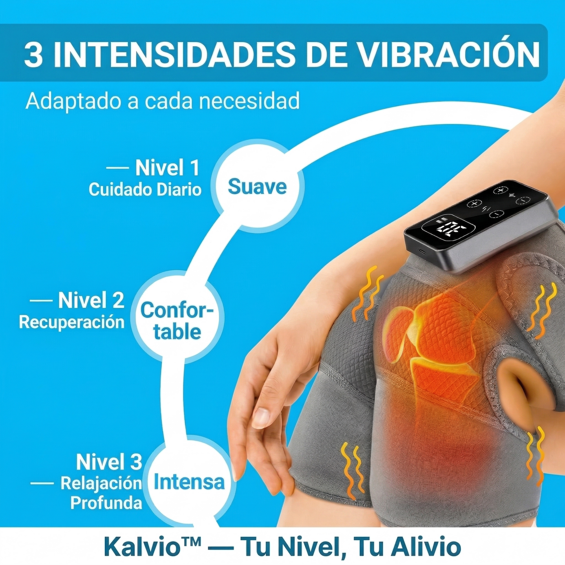 Sí. Kalvio™ es talla única ajustable. El sistema de velcro se adapta a cualquier tamaño de rodilla — izquierda o derecha — sin apretar de más. Puedes elegir entre 3 niveles de calor y 3 niveles de vibración según lo que necesites cada día.